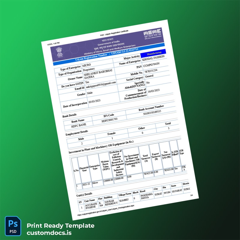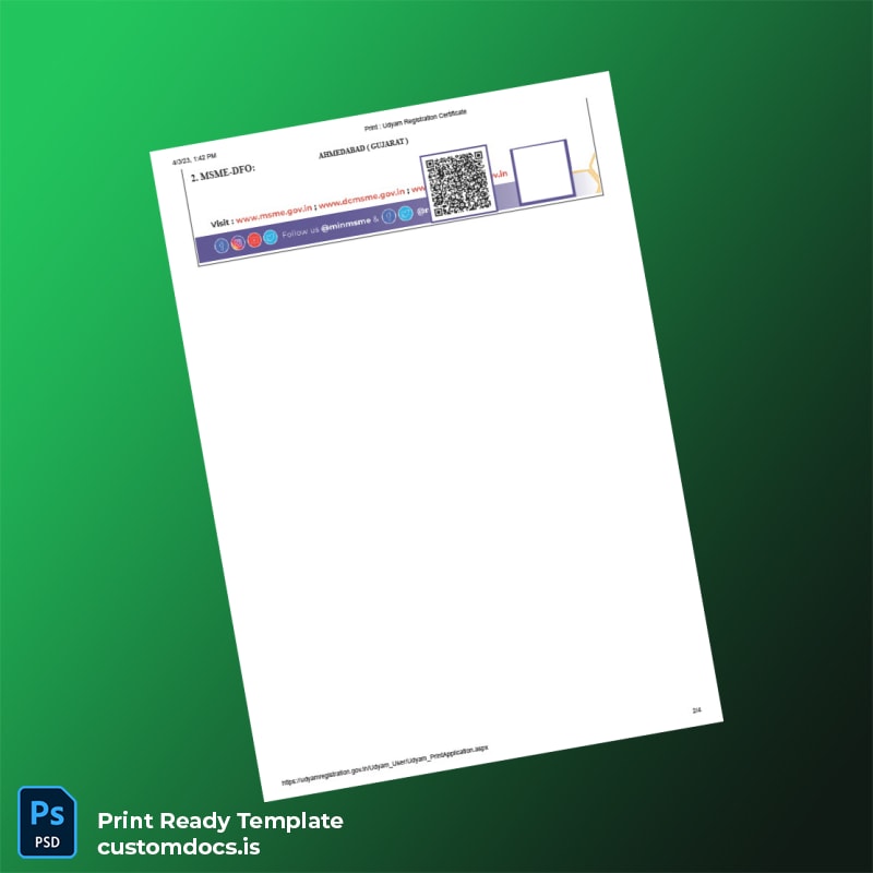 India Ministry of Micro Small and Medium Enterprises Udyam Registration Certificate Template – Word & PDF 4 page