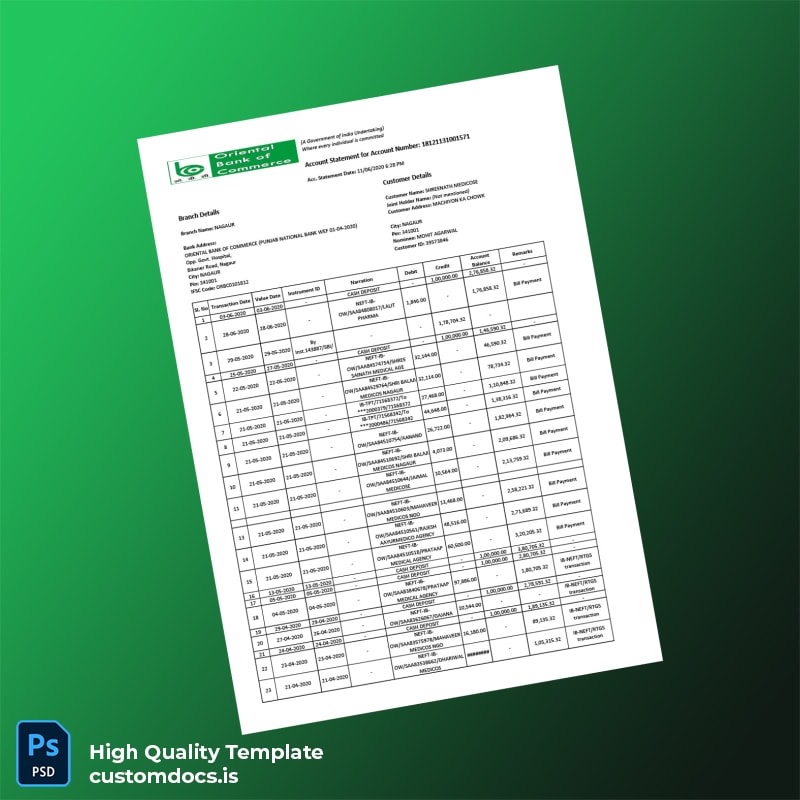 Don’t let document issues hold you back. Empower yourself with the India Oriental Bank of Commerce Bank Statement Template today. Enhance your productivity and ensure that your financial documents are always up-to-date and compliant. Click here for more information and get started now!
