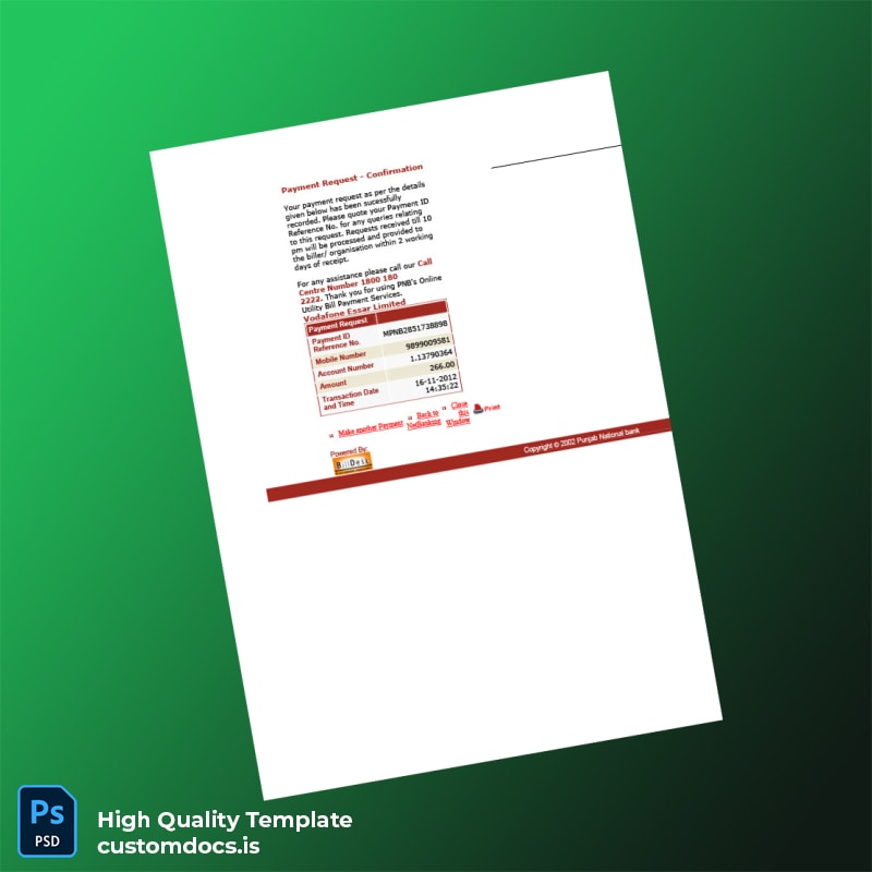 India Punjab National Bank Editable Payment Confirmation Template Overview