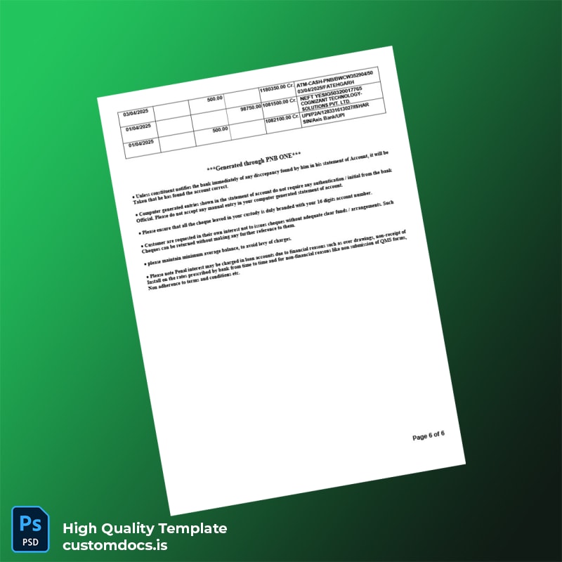 India Punjab National Bank Statement Template in Word and PDF formats 6 page
