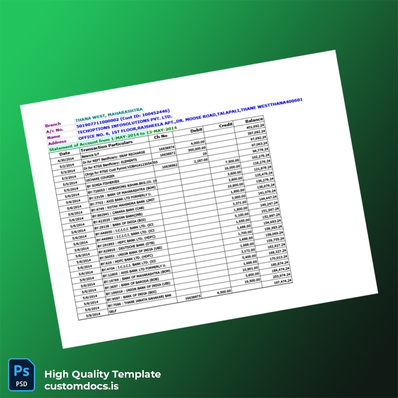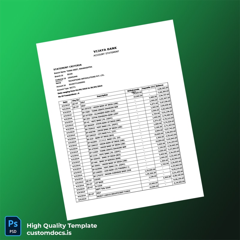 India Vijaya Bank Statement Template in Word and PDF Formats