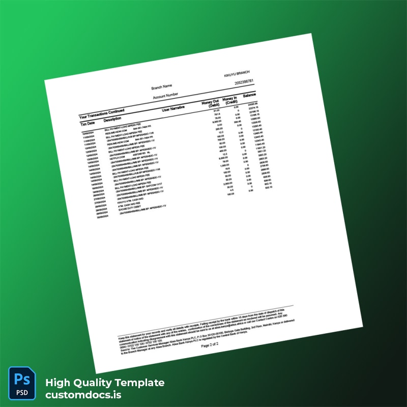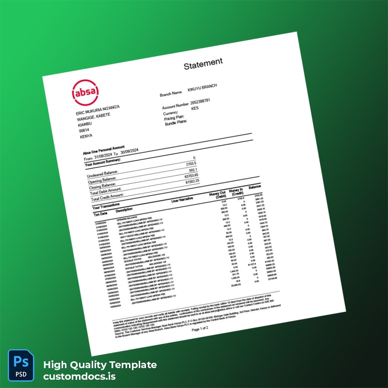 With the Kenya Absa Bank Statement Template, you gain peace of mind, knowing you can produce the required documents whenever necessary. Don’t compromise on quality or timeliness. Discover how easy documentation can be with our template and start impressing your clients today. For even more options, check out our range of related products like the premium bank statement templates.