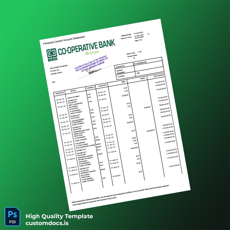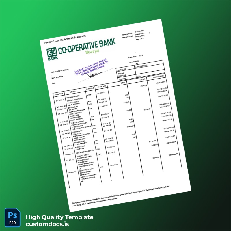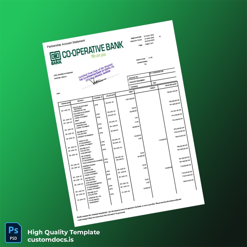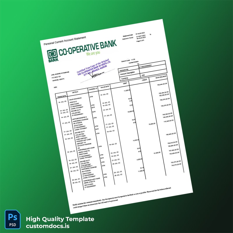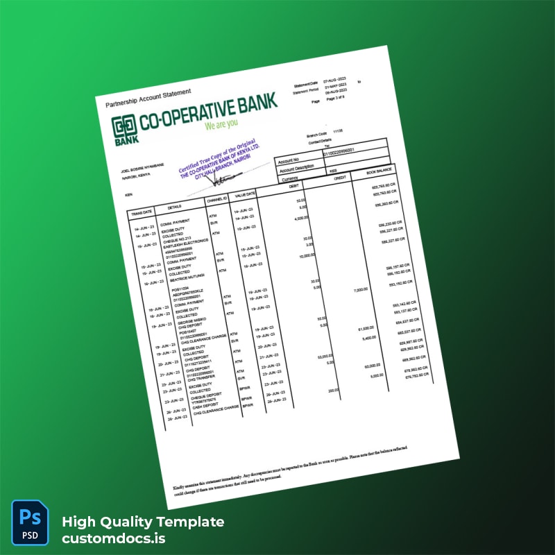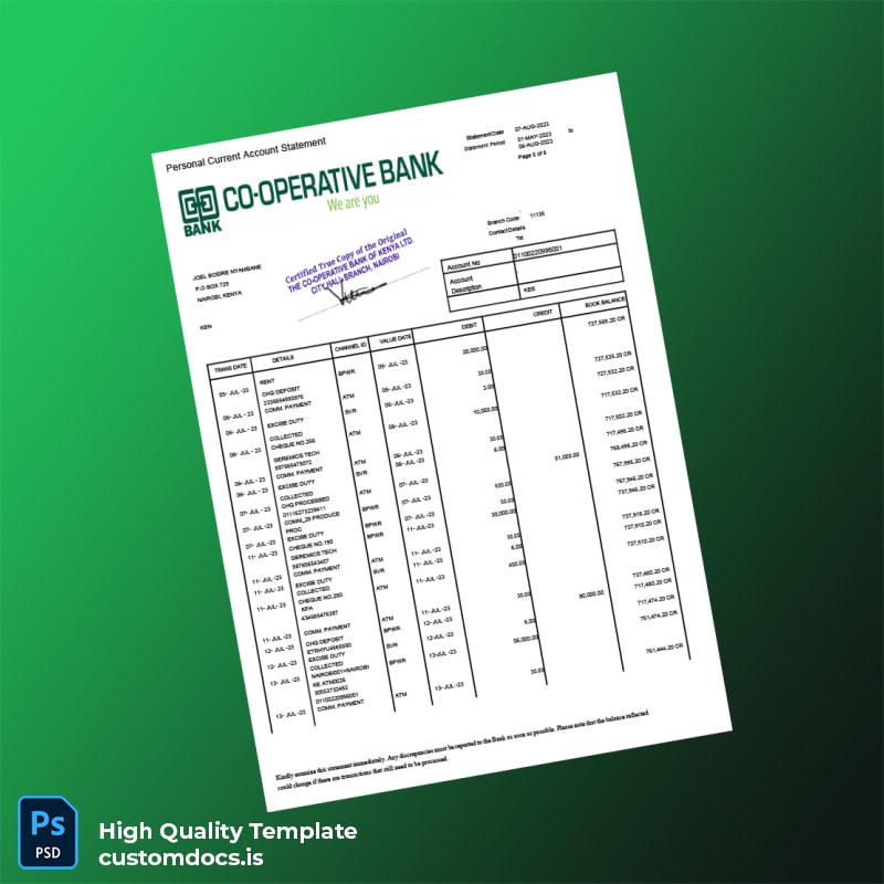 Our Kenya Co-operative Bank Statement Template uniquely addresses the needs of busy professionals who require prompt solutions. Ideal for individuals who need to present proof of funds or correct discrepancies, this template eliminates the hassle of waiting for official documents from the bank. It allows for quick adjustments to fit specific needs, making it an invaluable tool for freelancers, business owners, or anyone on the go.