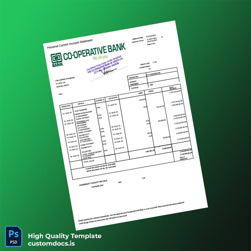 Kenya Co-operative Bank Statement Template in Word and PDF formats 8 page