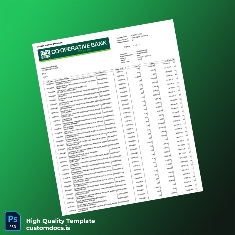Are you struggling to produce a polished bank statement for personal or professional needs? The Kenya Cooperative Bank Account Statement Template in Word and PDF formats is designed to simplify your life. With this editable bank statement template, you can easily create custom documents that look official and are ready to share in no time.