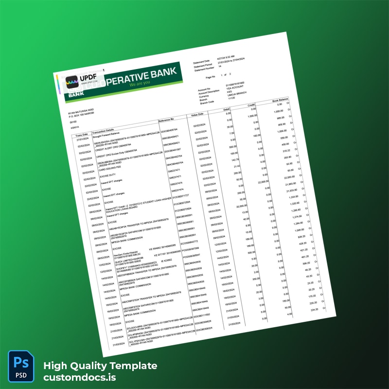 Kenya Cooperative Bank Statement Template in Word and PDF formats 2 page