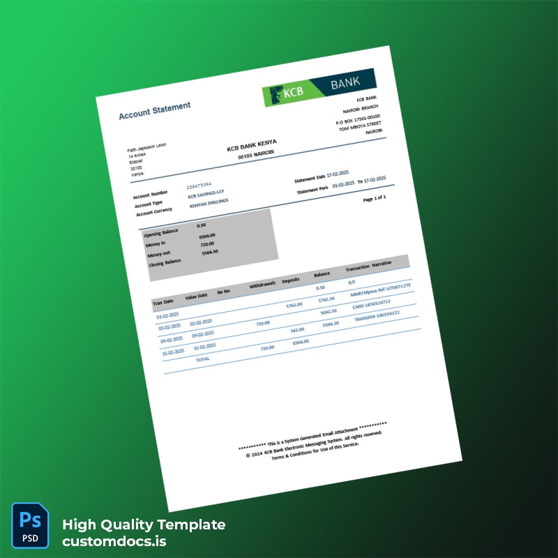 Are you facing the hassle of recreating lost or expired bank statements? The Kenya KCB Bank Account Statement Template in Word and PDF formats is your solution. Designed with creative and technical professionals in mind, this template allows you to generate authentic-looking bank statements effortlessly.
