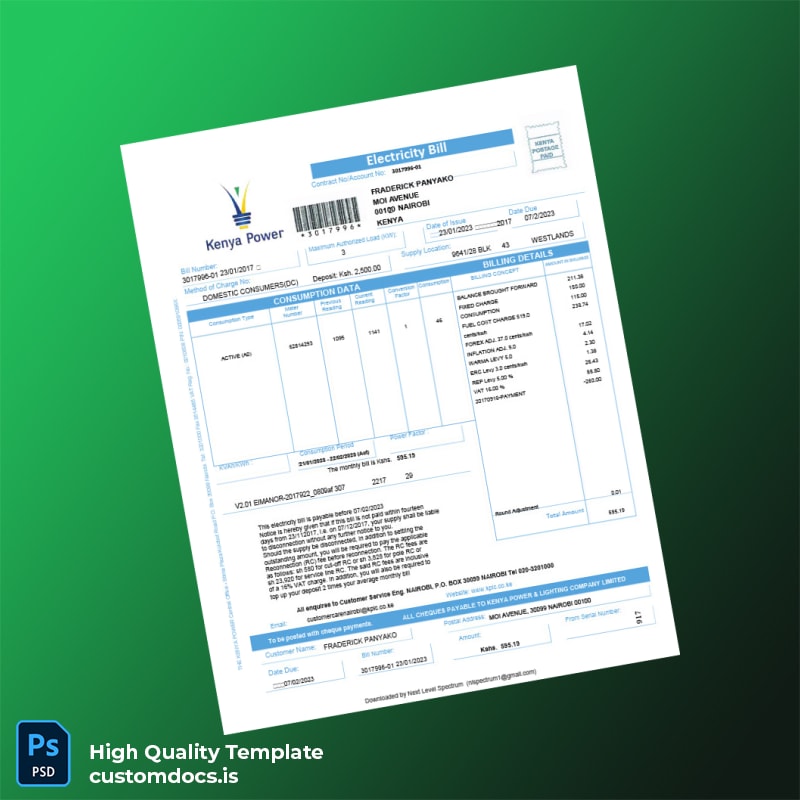 Kenya KPLC Editable Utility Bill Template in Word and PDF Formats
