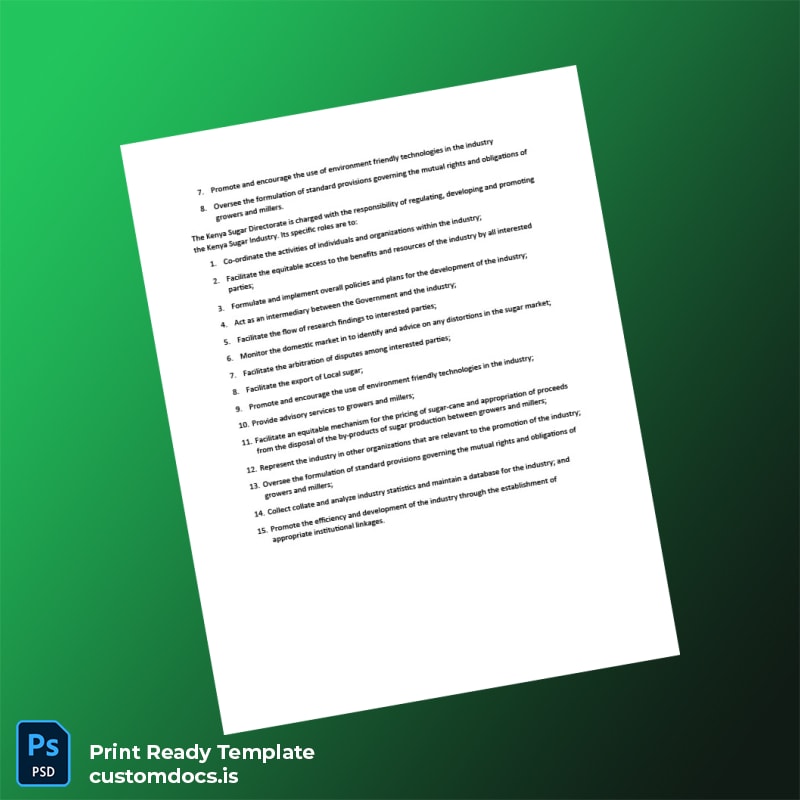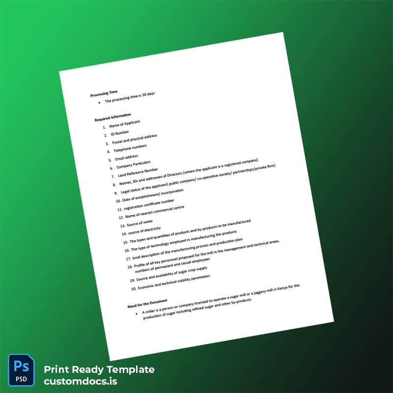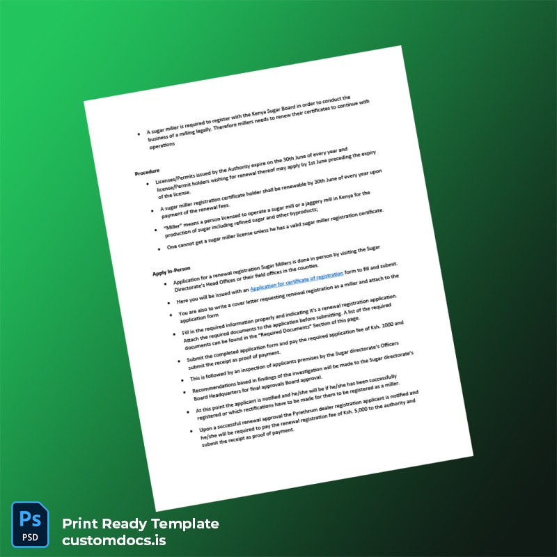Optimize your document management by investing in the Kenya Sugar Miller Registration Renewal Certificate Template – Word & PDF today. Experience the convenience of an editable, printable, and compliant solution designed to empower your business operations.