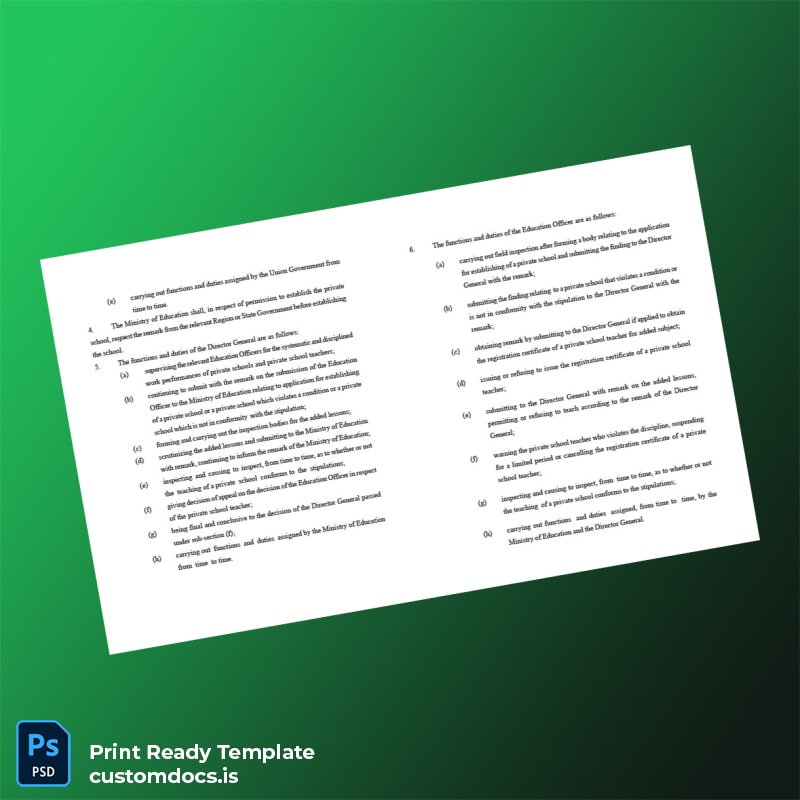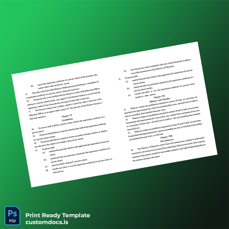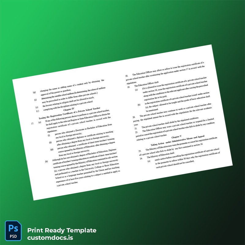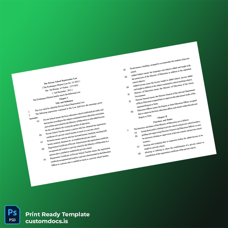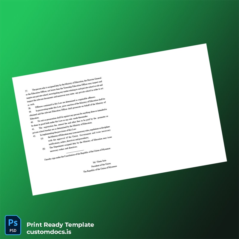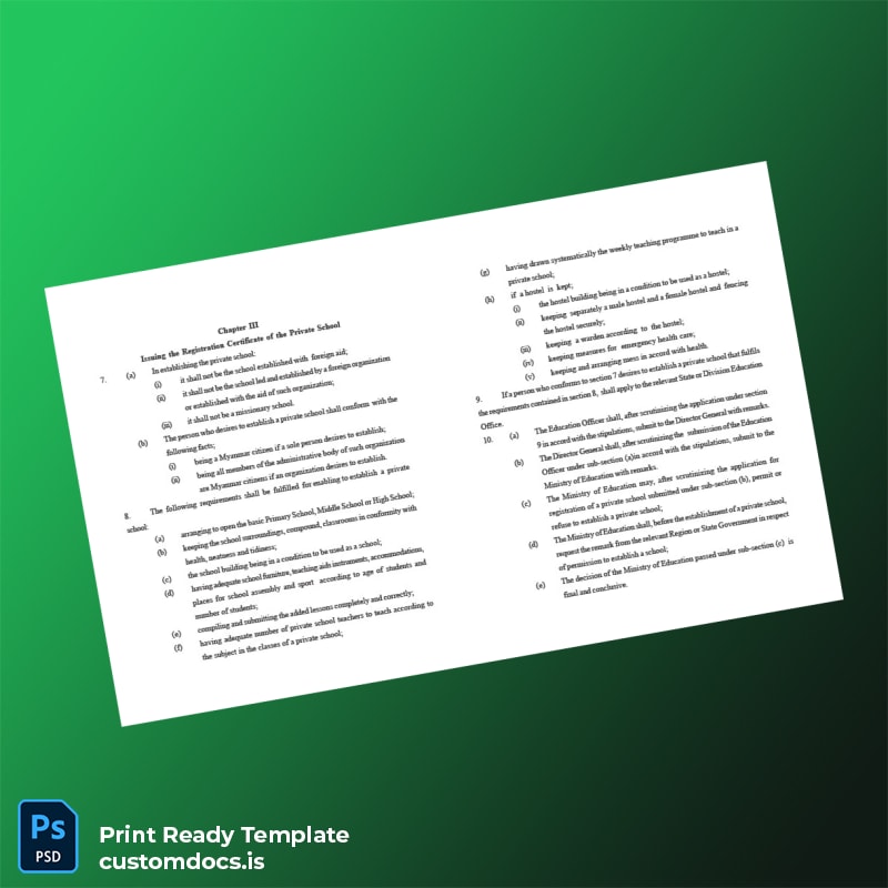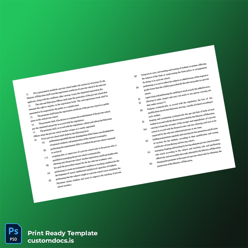 The Myanmar Ministry of Education Private School Registration Certificate Template – Word & PDF is designed to simplify the registration process for school administrators and education professionals. This editable registration certificate offers an efficient and reliable solution for creating official registration documents without hassle or delay.