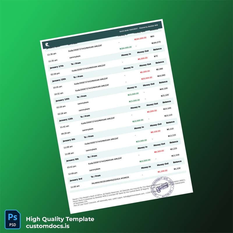 Nigeria Raven Bank Statement Template in Word and PDF formats