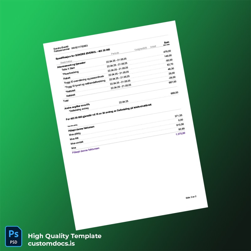 Norway Telia Norge AS Editable Phone Bill Template in Word and PDF formats 2 page