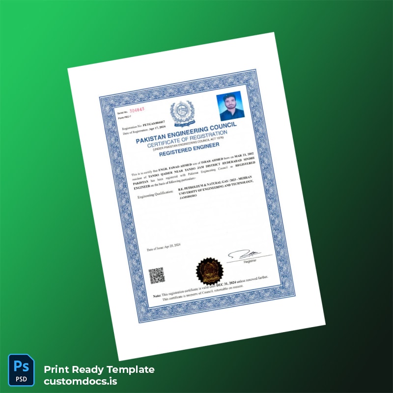 Professional Pakistan Engineering Council Registration Certificate Template – Word & PDF