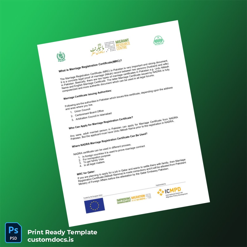 The Pakistan NADRA Marriage Registration Certificate Template – Word & PDF offers a user-friendly, editable solution for individuals and professionals seeking to quickly generate a compliant and official-looking marriage registration certificate. This versatile template caters to a wide range of needs by providing a fully customizable format that enables easy updating of personal details while maintaining a professional appearance suitable for legal and record-keeping purposes.