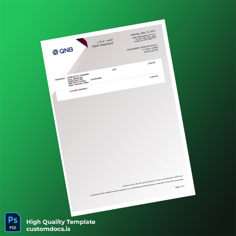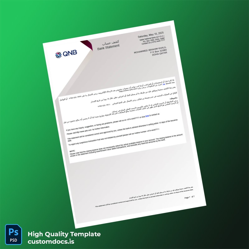 Your time is valuable, and losing an important financial document like your Qatar National Bank account statement can be frustrating. But it doesn’t have to be. Introducing our Qatar National Bank Account Statement Template in both Word and PDF formats—your quick solution to recovery.