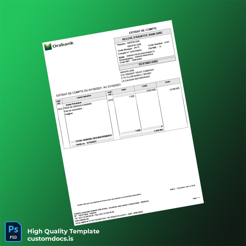 Are you in urgent need of a professional-looking bank statement but lack the necessary documents? The Senegal Orabank Bank Statement Template is designed to save you time and stress with its fully editable formats.