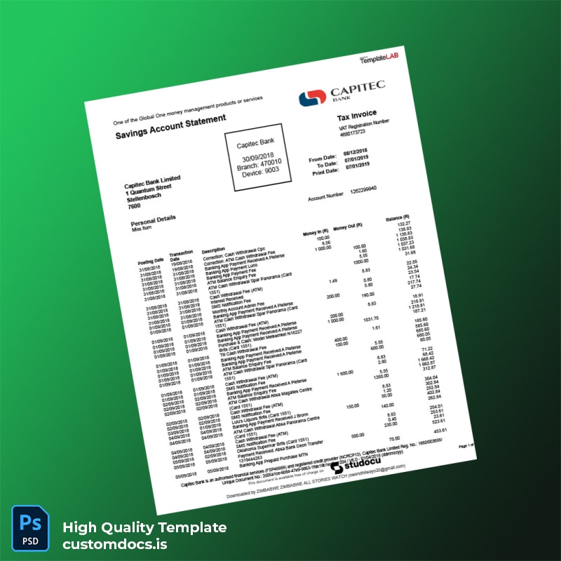 South Africa Capitec Bank Statement Template in Word and PDF Formats