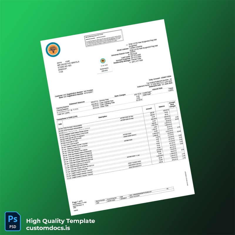 Are you struggling to provide a legitimate bank statement for a loan application, rental agreement, or another urgent requirement? Our South Africa Easy Account Bank Statement Template is designed to meet your needs, allowing you to create a professional and editable document effortlessly.