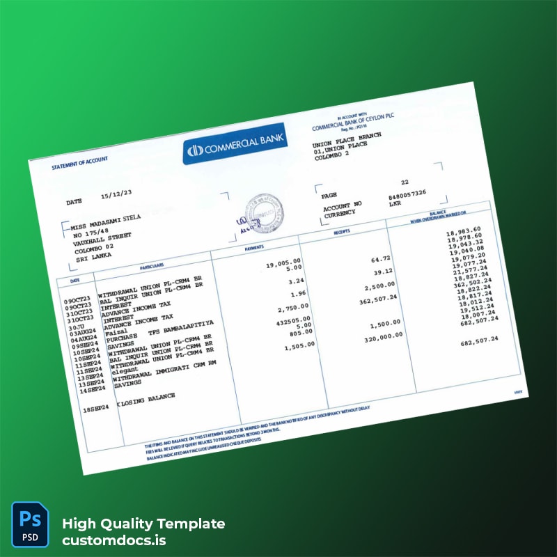Sri Lanka Commercial Bank of Ceylon PLC Bank Statement Template