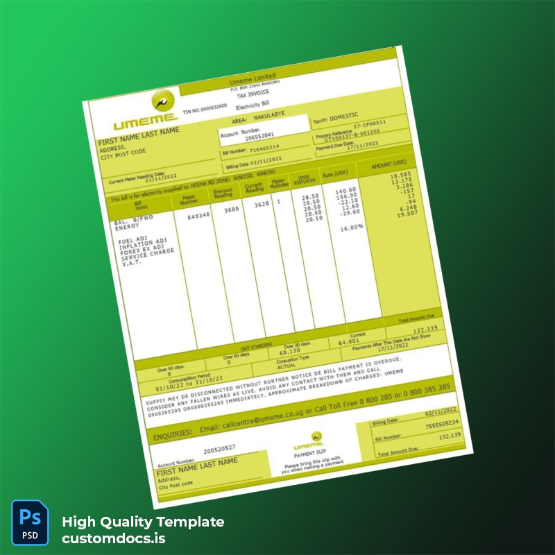 No need to worry about formatting issues or font mismatches: the template comes with preloaded fonts matching official Umeme bills for an authentic and polished appearance.