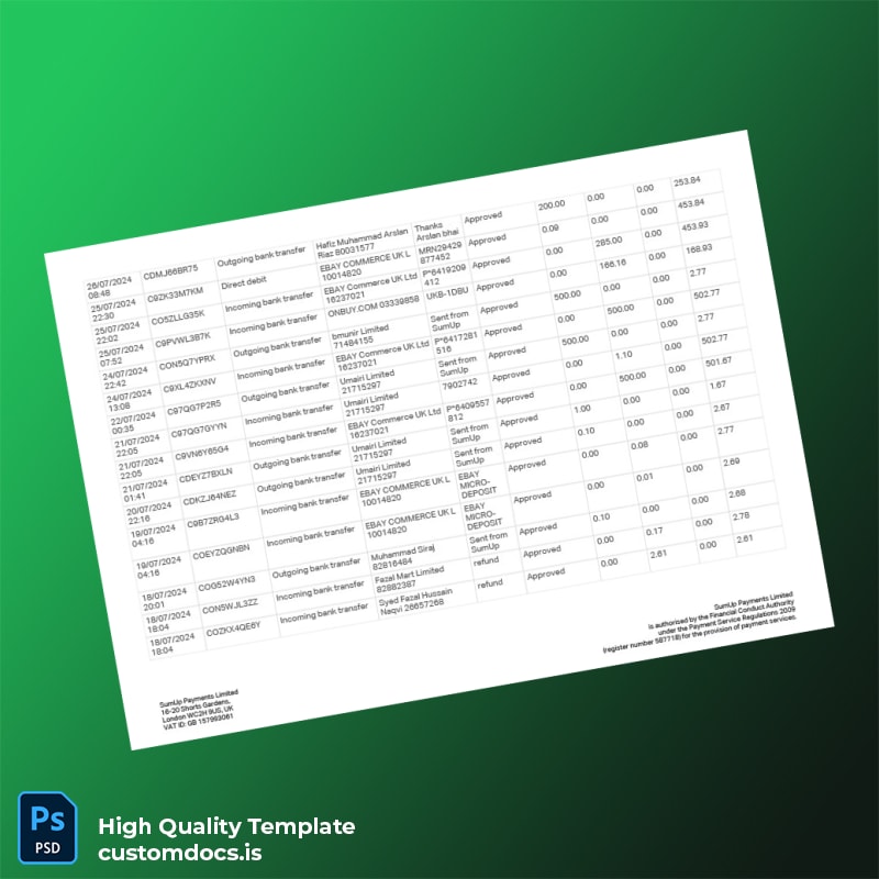 Don’t let missing documents hold you back from your next opportunity. Invest in our UK SumUp Account Statement Template today, and experience the convenience and professionalism that it brings to your financial documentation. For further options, explore our related products, such as the bank statement template Word and bank statement template PDF. Your professional image deserves the best!