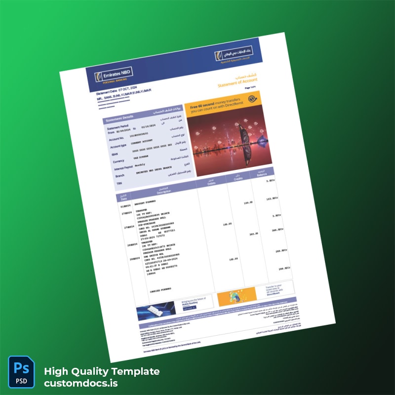 The need for a reliable and professional bank statement template is critical for many professionals facing urgent documentation requirements. Whether you’ve lost your original statement, need an updated version for loan applications, or have a tight deadline, our United Arab Emirates Emirates NBD Account Statement Template in Word and PDF formats is tailored to meet your needs quickly and efficiently.