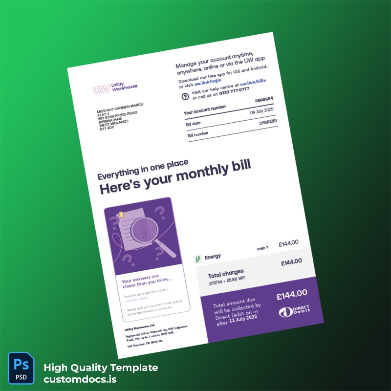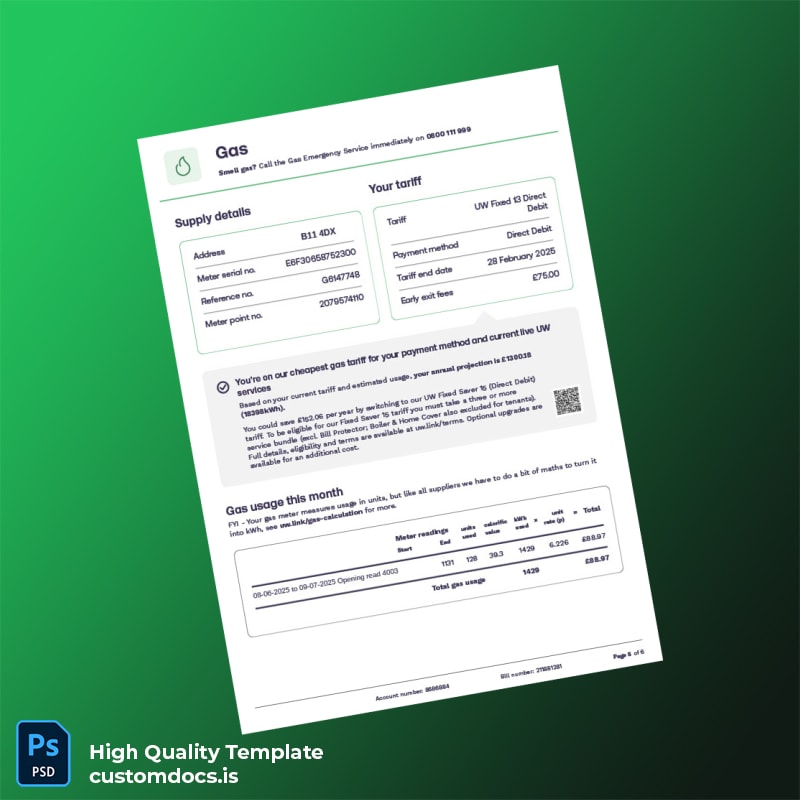 Effortlessly create a professional and authentic-looking utility bill proof of address with our United Kingdom Editable Utility Bill Template, available in both Word and PDF formats. Designed for quick customization and reliable results, this template is an essential resource for professionals needing a fast, flexible, and credible utility bill substitute.