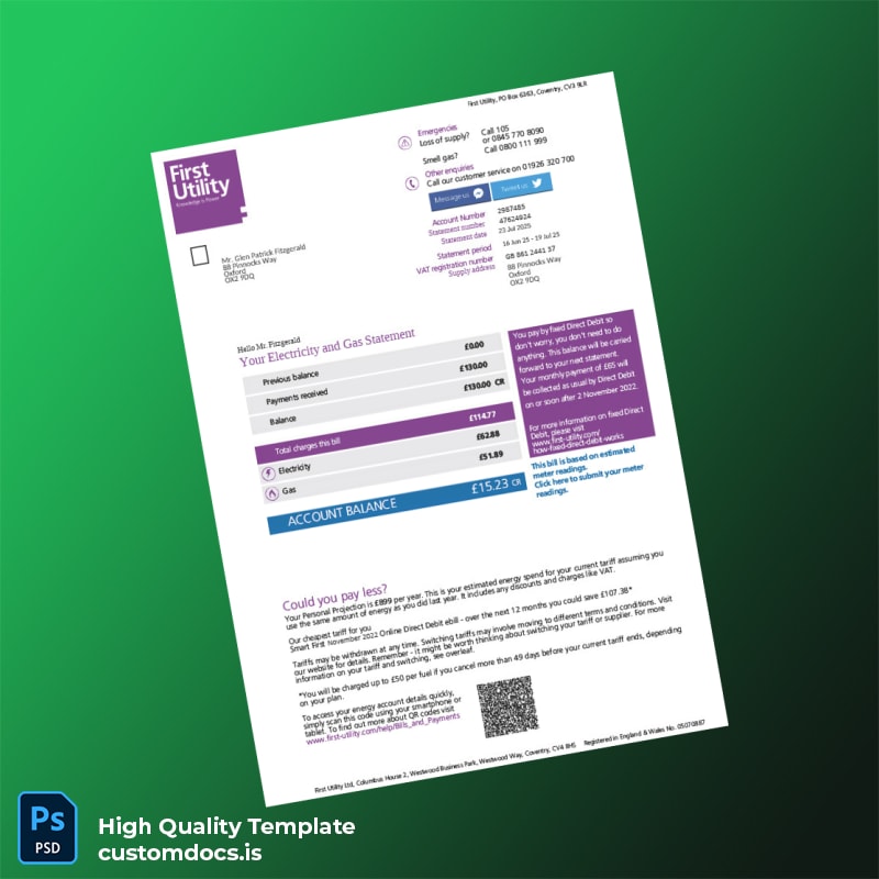Don’t let missing or expired documents slow you down. Get instant access to the United Kingdom First Utility Ltd Editable Electricity Bill Template today and ensure your proof of address needs are met without hassle. For comprehensive utility bill options, visit the utility bill template category and secure your professional-grade editable documents now.