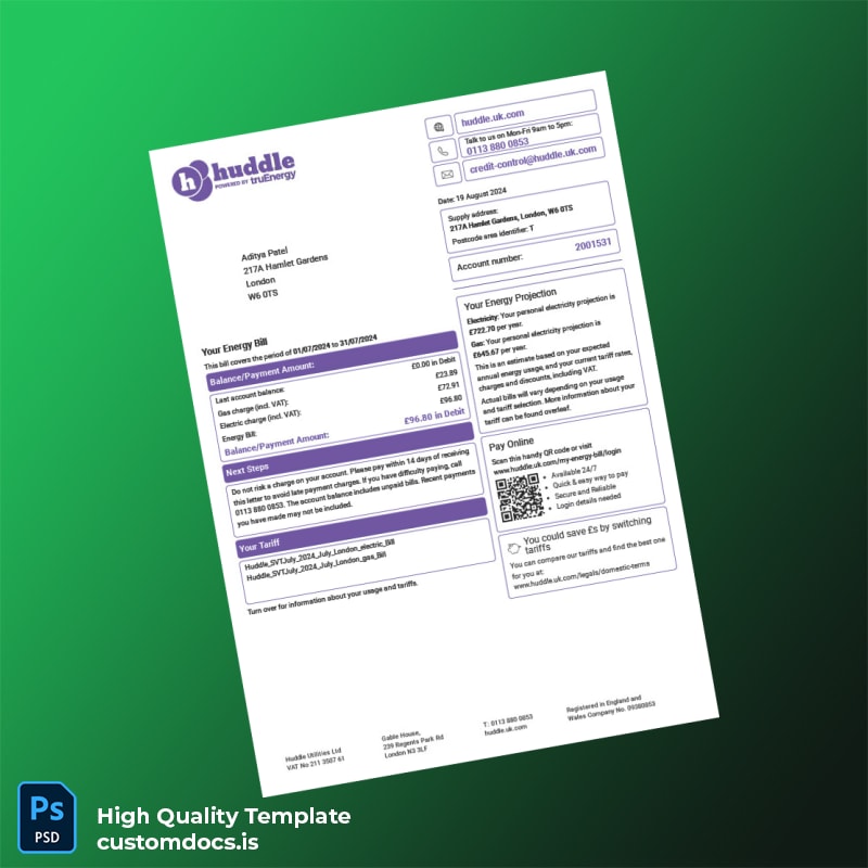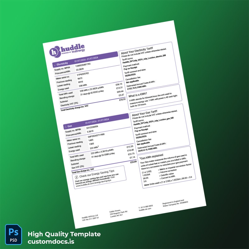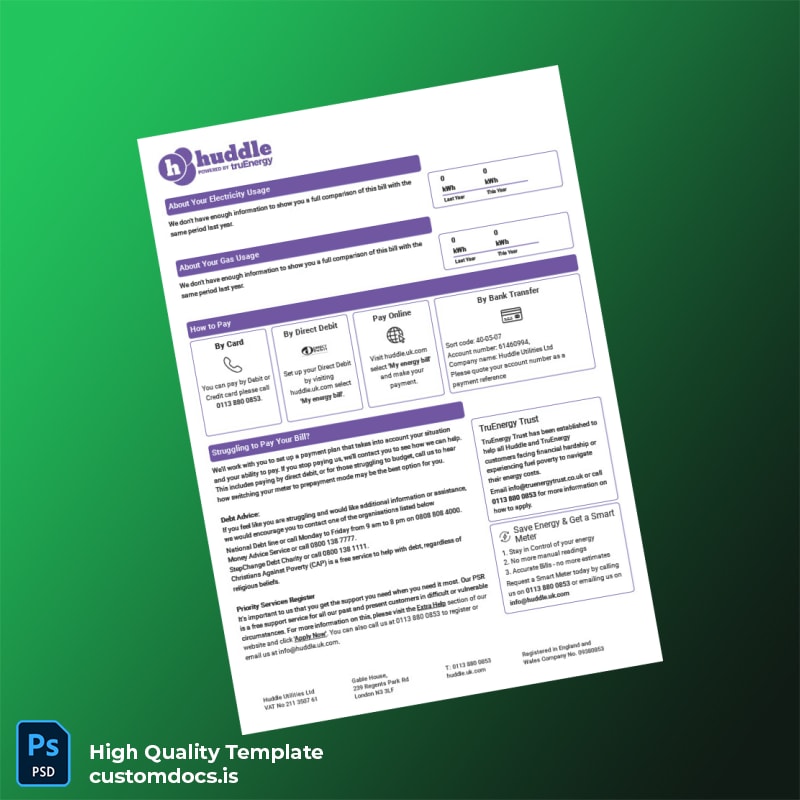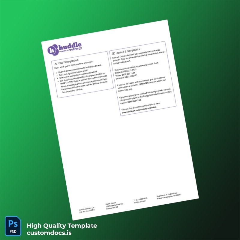 United Kingdom Huddle Energy Editable Utility Bill Template in Word and PDF Formats
