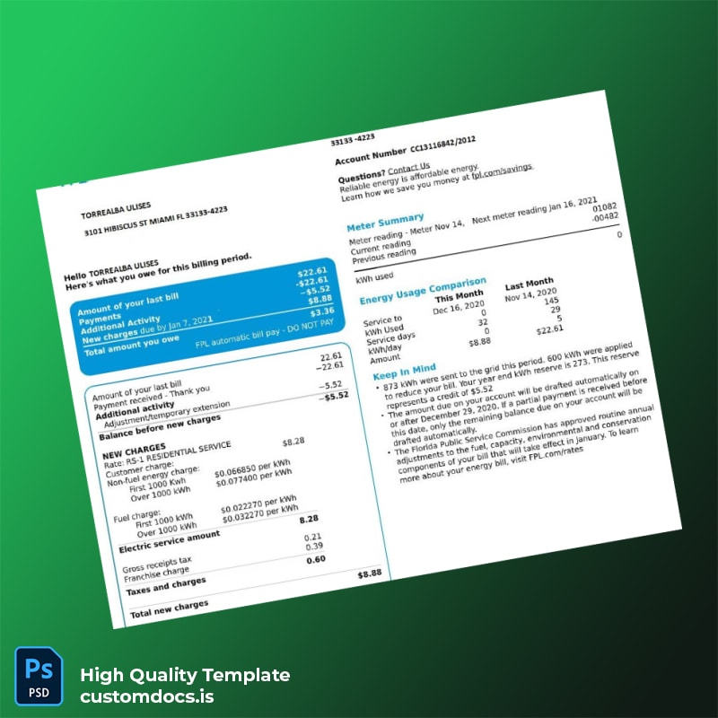 United States FPL Editable Utility Bill Template in Word and PDF Formats