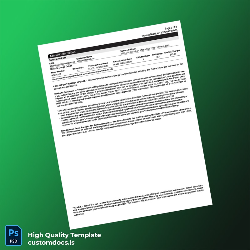Don’t let missing utility bills hold you back. Download the United States Reliant Energy Retail Services LLC Editable Electricity Bill Template today and gain instant access to a fully editable, professional, and print-ready utility bill PDF file download. For more options, explore the broader utility bill template category and find other editable templates tailored to your unique needs.