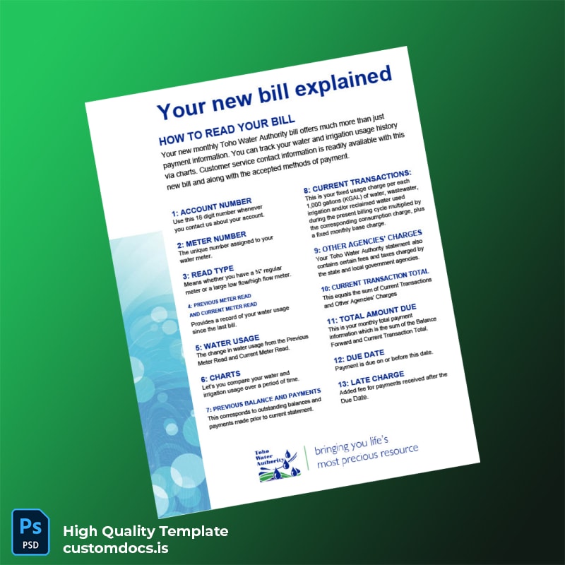 United States Toho Water Authority Editable Utility Bill Template in Word and PDF formats 2 page