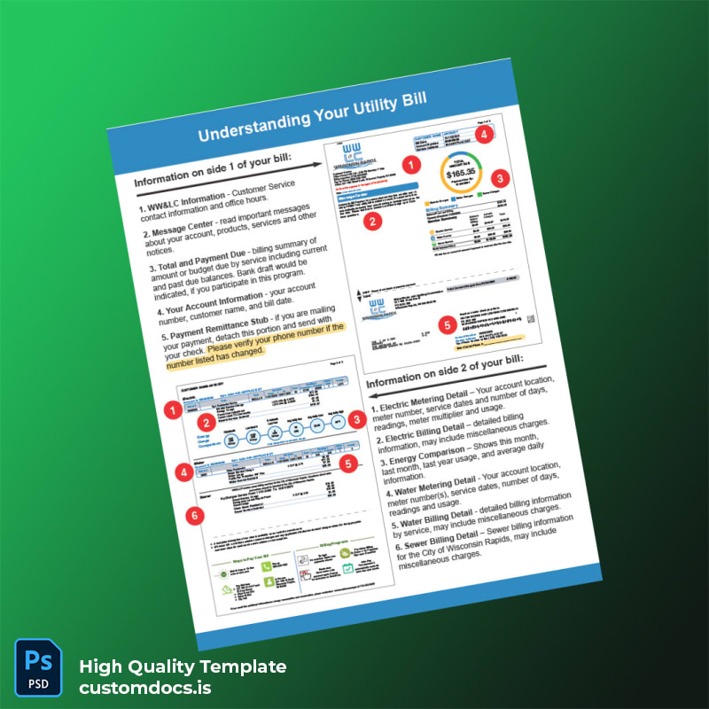 This editable utility bill template offers a professional and reliable solution for individuals and businesses needing an accurate proof of address document instantly. Available in both Word and PDF formats, it is specifically designed to replicate the United States Wisconsin Rapids Water And Light Commission’s utility bill, making it ideal for quick personal or official use.