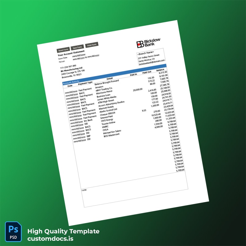 Introducing the US Bit Manufacturing Ltd Bank Statement Template, designed in both Word and PDF formats for your convenience. This editable bank statement template is not just a document; it’s your reliable tool in professional scenarios requiring timely and efficient solutions.