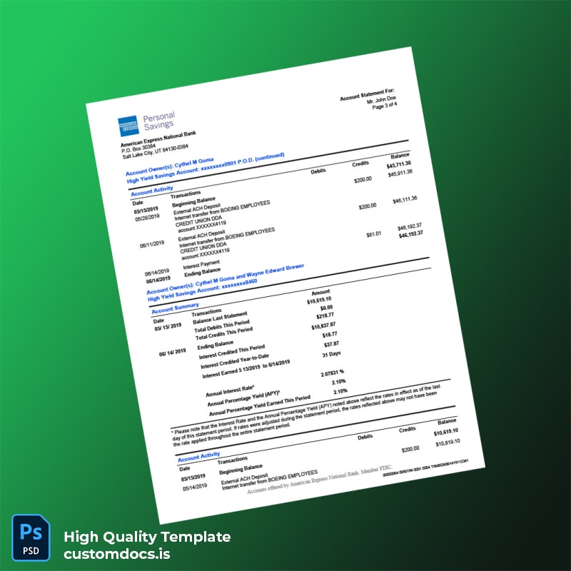 Professionals often encounter the frustration of needing to replace lost or stolen financial documents quickly. Our USA American Express Bank Statement Template addresses this pain point effectively by providing a straightforward way to generate an editable bank statement. Other customers have utilized our templates when applying for loan approvals or financial assessments, ensuring they have the necessary documentation at hand.