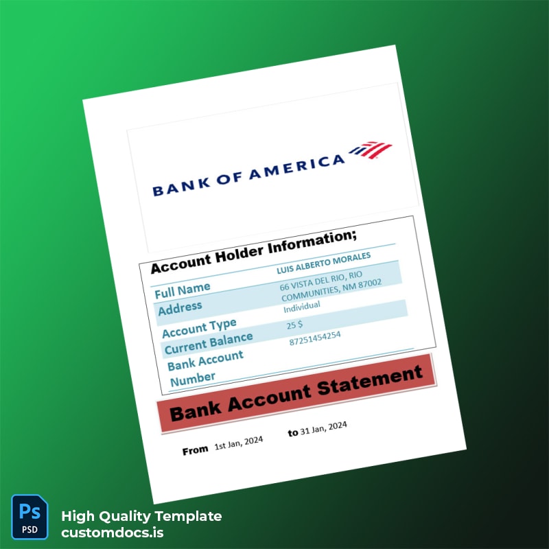 Don’t let a missing bank statement hinder your progress. Take control of your financial documentation today and ensure you have access to reliable documents when needed. Download your USA Bank of America Bank Account Statement Template now and step towards effortless financial management.
