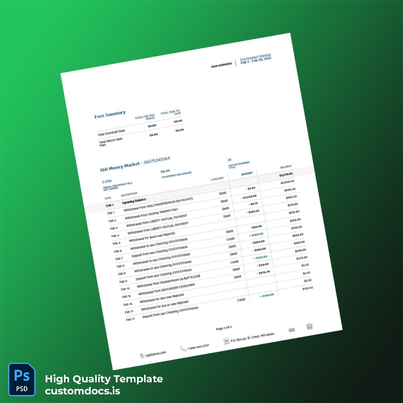 Don’t let the lack of a bank statement hold you back. Invest in the USA Capital One Bank Statement Template today and enjoy the peace of mind that comes with having your documents ready when you need them. For further options, explore our related products: the 3 months bank statement PDF and the 6 months bank statement PDF.
