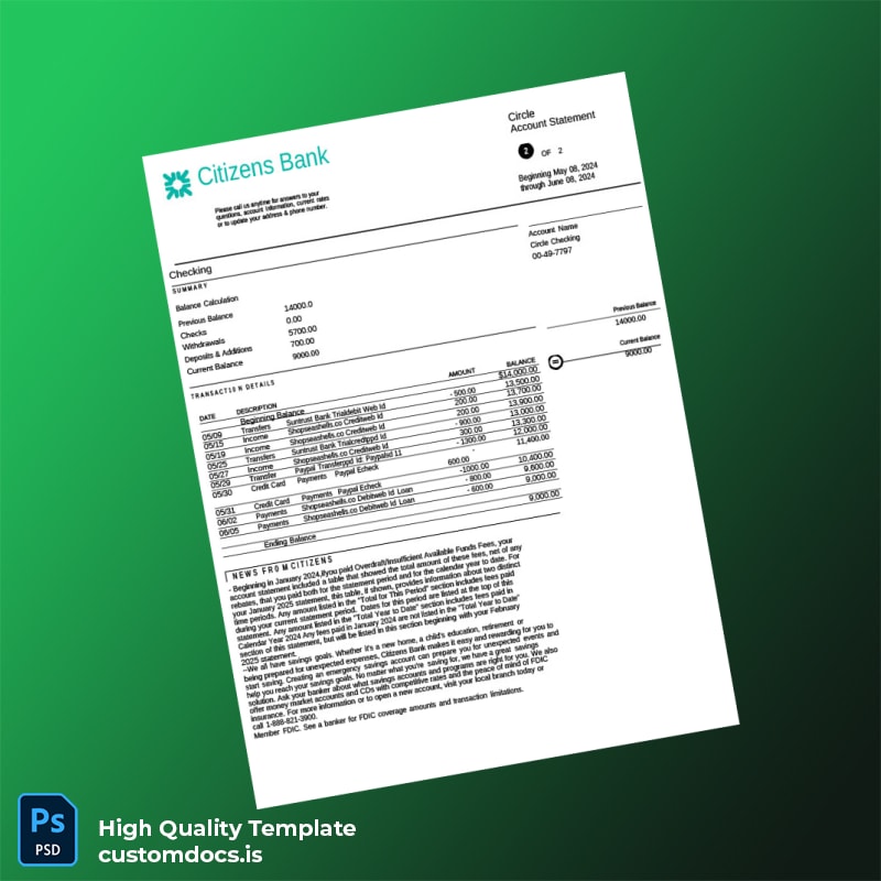 USA Citizens Bank Account Statement Template in Word and PDF Formats