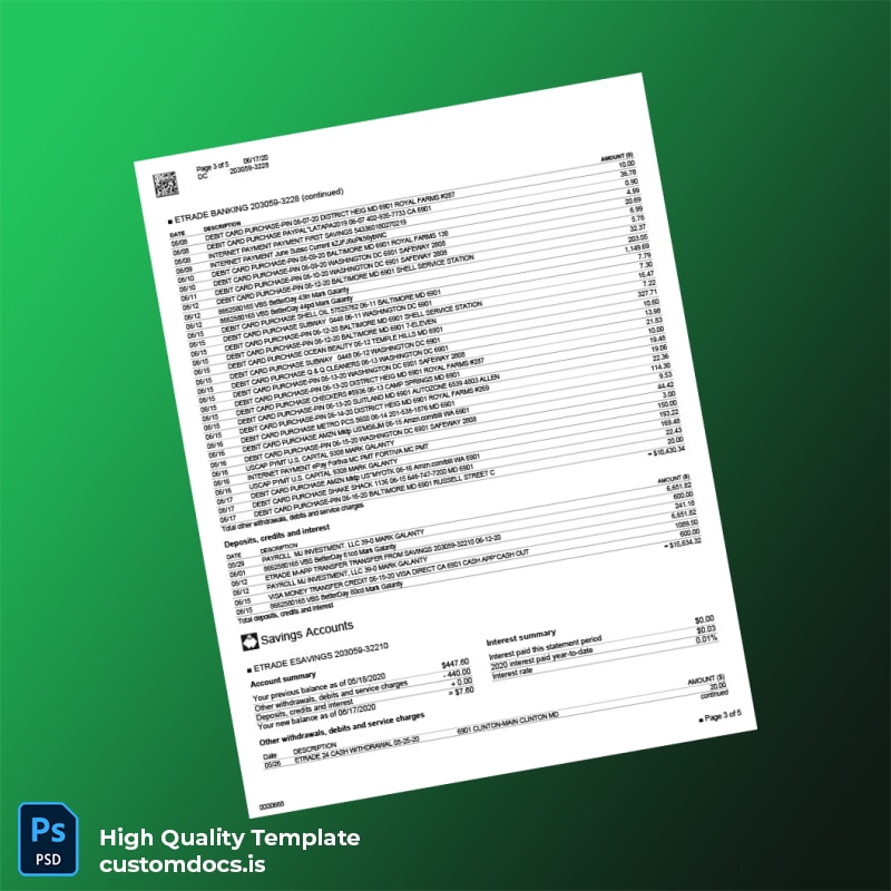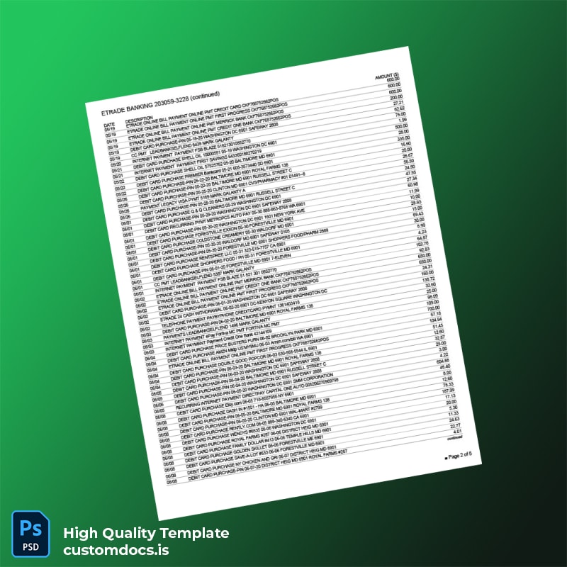 Need a reliable bank statement template to fulfill immediate documentation requests? Our USA Etrade Bank Statement Template in Word and PDF formats is designed for professionals who require authentic-looking documents swiftly, whether for loan applications, visa requirements, or personal record-keeping.
