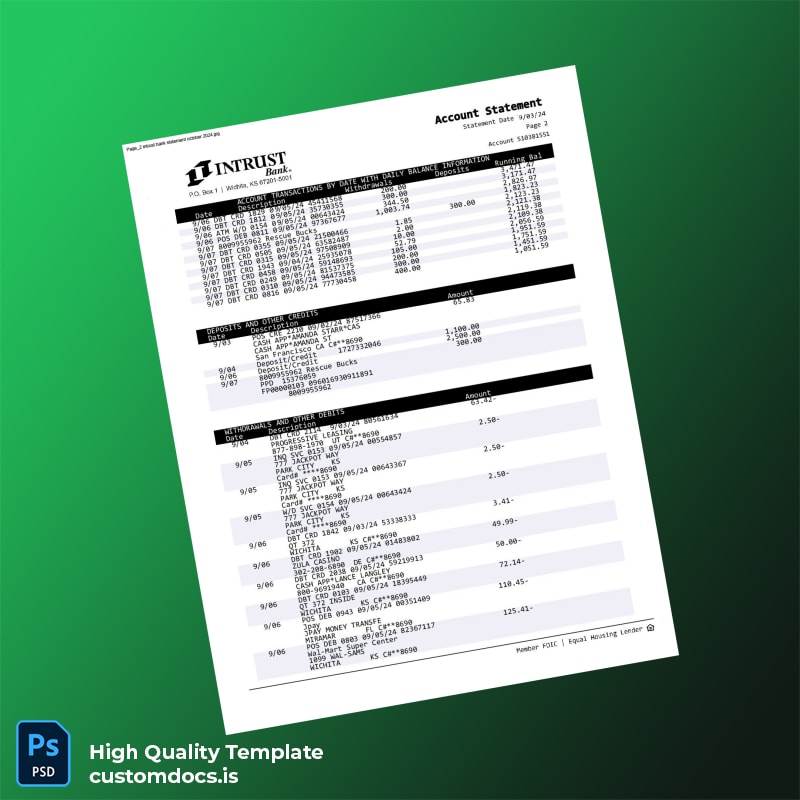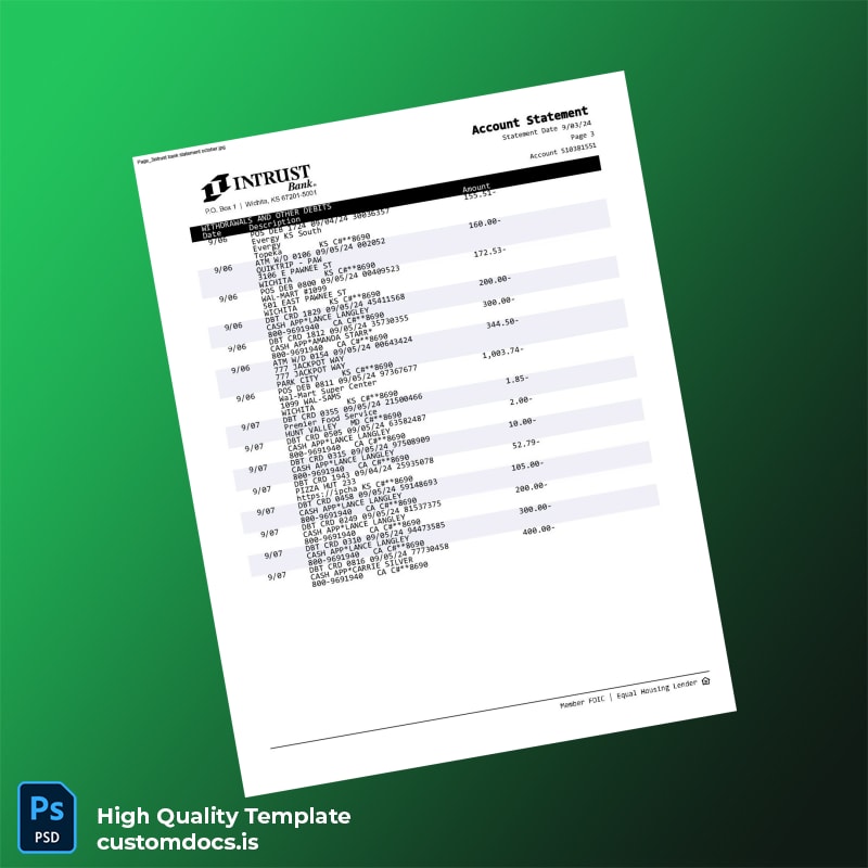 Don’t let paperwork hold you back any longer. Streamline your document management with our versatile and user-friendly template. Download the USA INTRUST Bank Statement Template today to experience the relief of having an editable bank statement template at your fingertips. For additional options, explore our related products, including editable bank statement template word and 3 months bank statement pdf. Secure your template now and simplify your professional documentation processes!