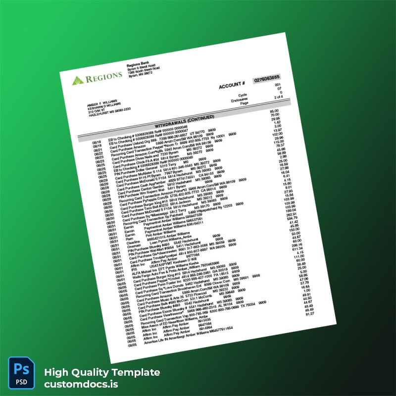 Transform your financial documentation with our USA Regiones Bank Statement Template, available in both Word and PDF formats. Designed for quick customization, this template is the ideal solution for professionals needing to generate impressive and accurate bank statements effortlessly.