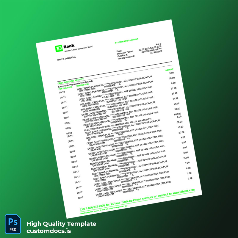 Have you ever faced the hassle of needing an official bank statement quickly? Whether it’s for a loan application, visa processing, or simply a personal record, obtaining a and professional-looking bank statement can be a daunting task. Our USA TD Bank Statement Template in Word and PDF formats is designed to alleviate that stress.